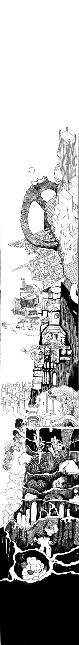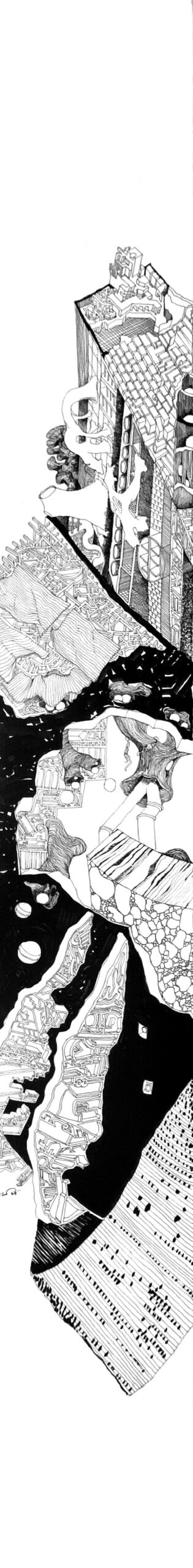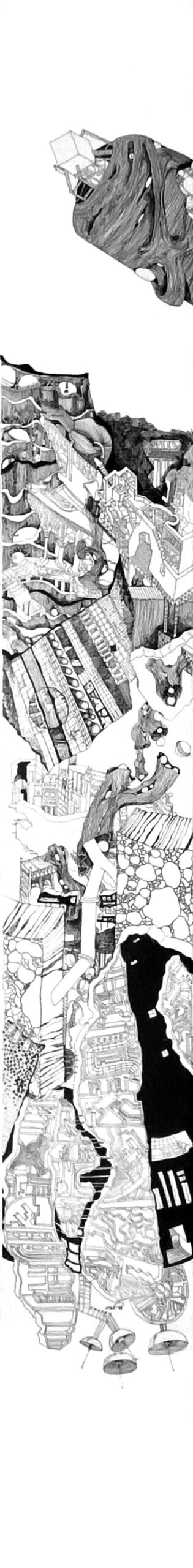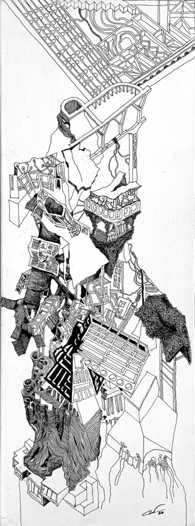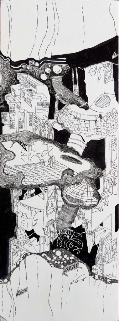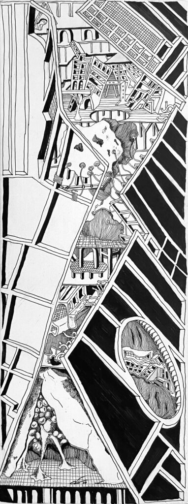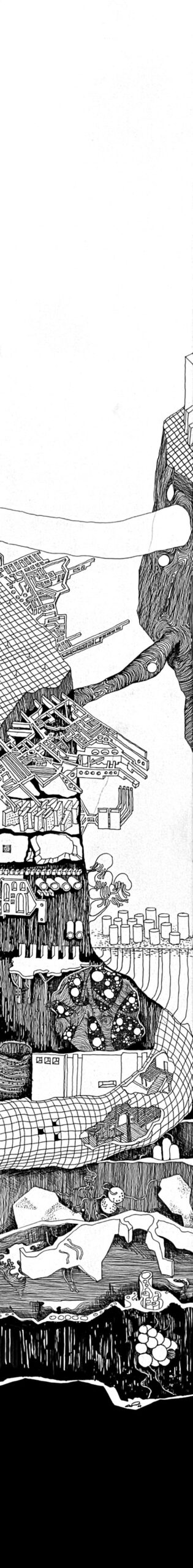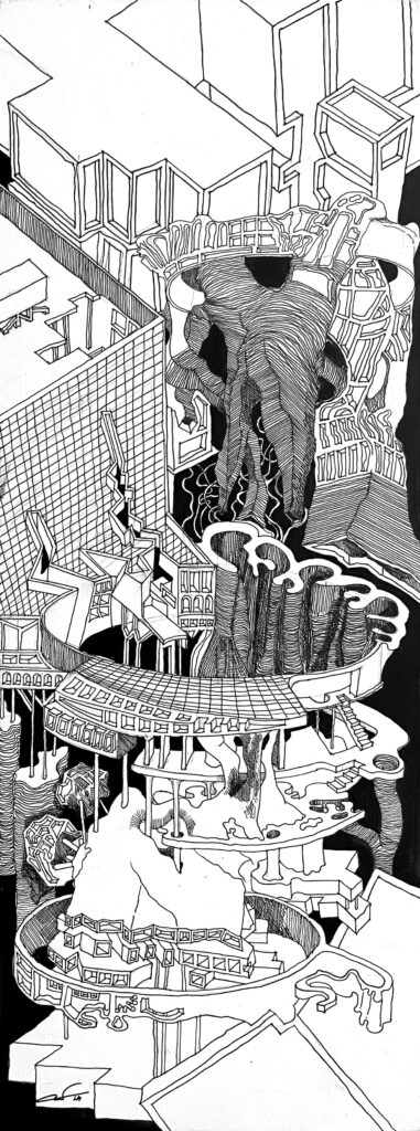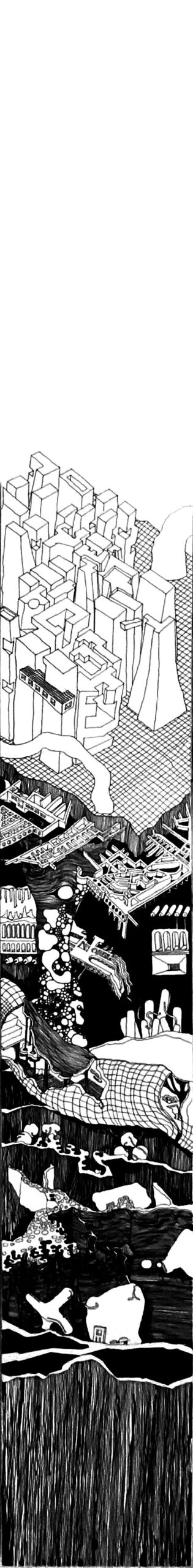 The Imaginaries are a series of speculative architectural drawings that construct evolving architectural worlds, where space is not conceived as a fixed or final form, but as a continuous sequence of transformations unfolding across time, material processes, and multiple forms of agency. Positioned within the discourse of experimental architecture and future design thinking, these works explore new relationships between the built environment, ecology, and non-human systems. Situated between architectural drawing, ecological mapping, and surreal narrative, the Imaginaries operate as dense, hand-drawn landscapes that challenge conventional modes of architectural representation. Executed in a stark black-and-white palette, they employ repetition, texture, and intricate line-work to generate spatial fields that feel both systematic and unstable, bridging precision with abstraction. Order and disruption coexist within these compositions. Rhythmic patterns and modular geometries evoke industrial systems and urban infrastructures, yet they are continuously unsettled by forces of distortion, erosion, and mutation. Through this tension, the drawings propose a form of post-anthropocentric architecture—one that is not static, but contingent, shaped by dynamic interactions between the built, the biological, and the temporal. Rather than depicting resolved architectural objects, the Imaginaries foreground processes of transformation, decay, and regeneration. They invite the viewer to engage with architecture as an evolving condition—continuously negotiated, reconfigured, and reimagined beyond singular authorship. In doing so, the work contributes to emerging conversations around planetary urbanism, ecological futures, and multi-species urbanism.
