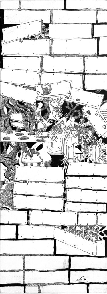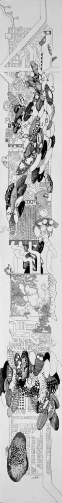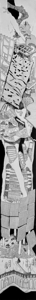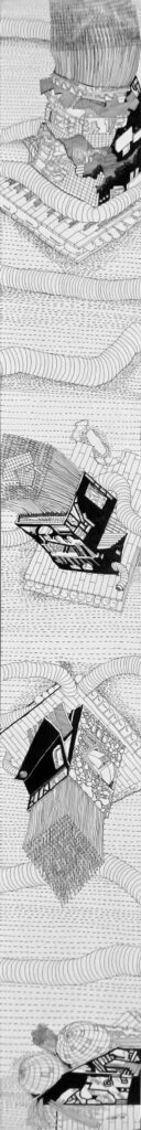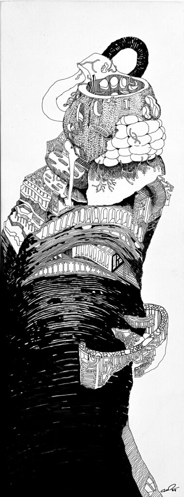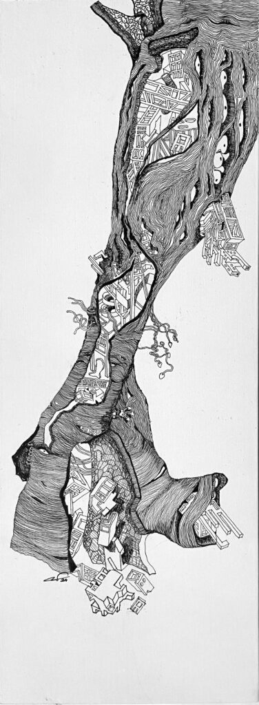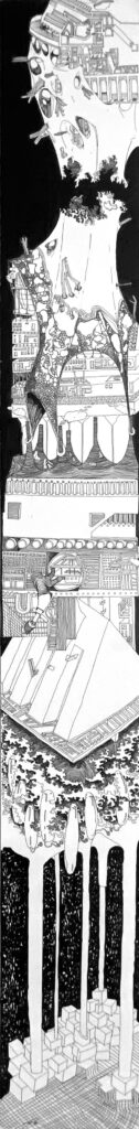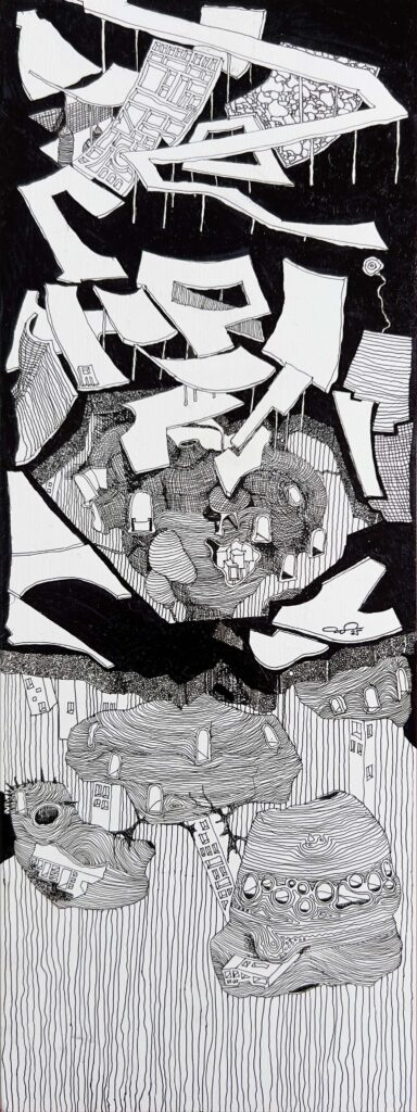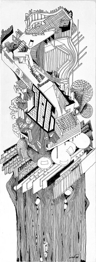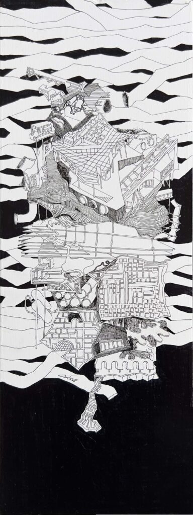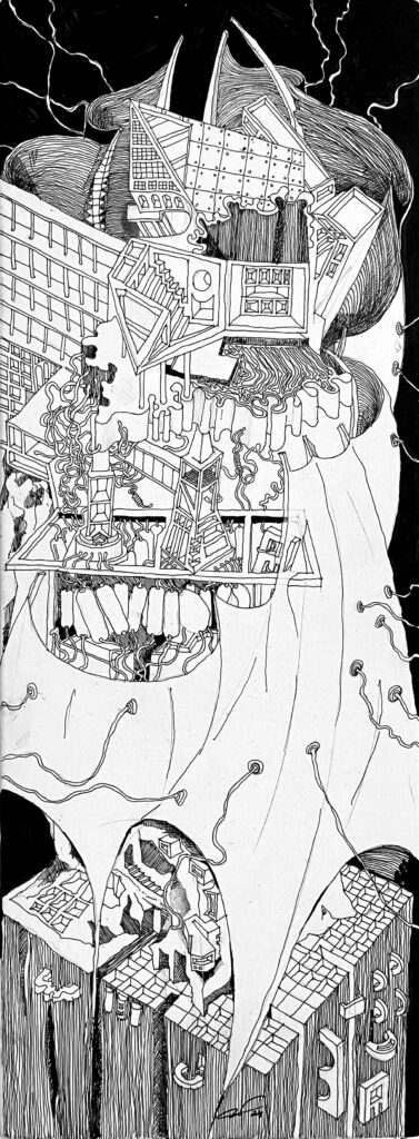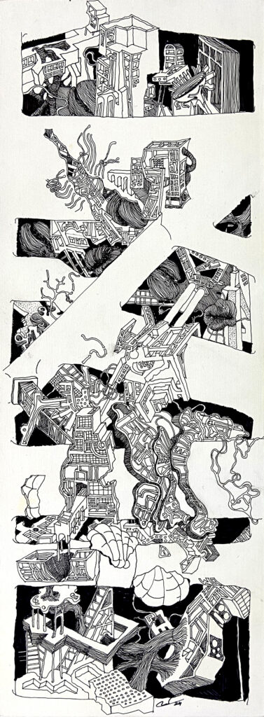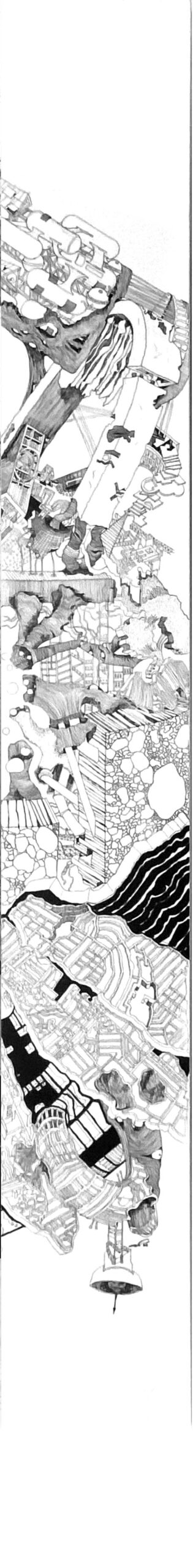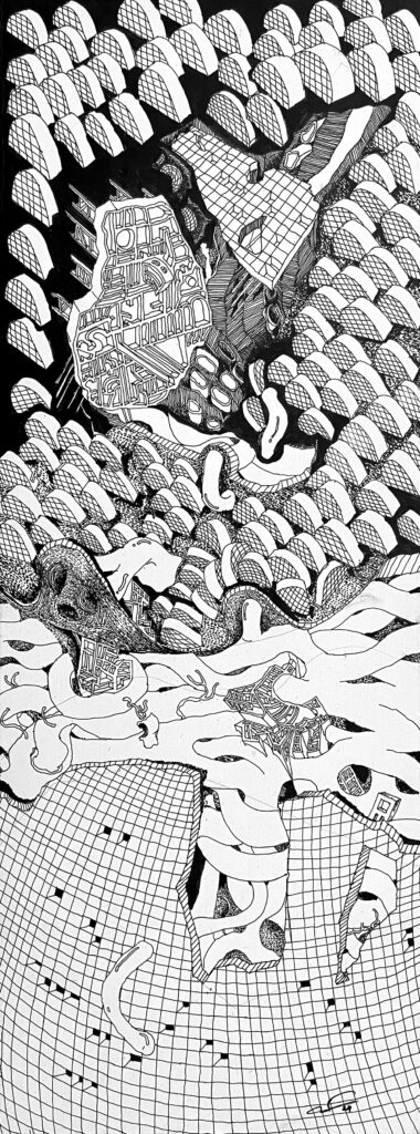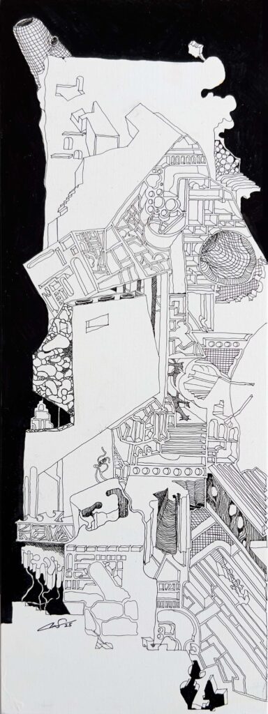 The Imaginaries are a series of speculative architectural drawings that construct evolving architectural worlds, where space is not conceived as a fixed or final form, but as a continuous sequence of transformations unfolding across time, material processes, and multiple forms of agency. Positioned within the discourse of experimental architecture and future design thinking, these works explore new relationships between the built environment, ecology, and non-human systems. Situated between architectural drawing, ecological mapping, and surreal narrative, the Imaginaries operate as dense, hand-drawn landscapes that challenge conventional modes of architectural representation. Executed in a stark black-and-white palette, they employ repetition, texture, and intricate line-work to generate spatial fields that feel both systematic and unstable, bridging precision with abstraction. Order and disruption coexist within these compositions. Rhythmic patterns and modular geometries evoke industrial systems and urban infrastructures, yet they are continuously unsettled by forces of distortion, erosion, and mutation. Through this tension, the drawings propose a form of post-anthropocentric architecture—one that is not static, but contingent, shaped by dynamic interactions between the built, the biological, and the temporal. Rather than depicting resolved architectural objects, the Imaginaries foreground processes of transformation, decay, and regeneration. They invite the viewer to engage with architecture as an evolving condition—continuously negotiated, reconfigured, and reimagined beyond singular authorship. In doing so, the work contributes to emerging conversations around planetary urbanism, ecological futures, and multi-species urbanism.