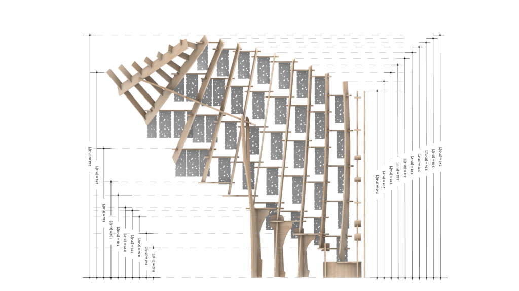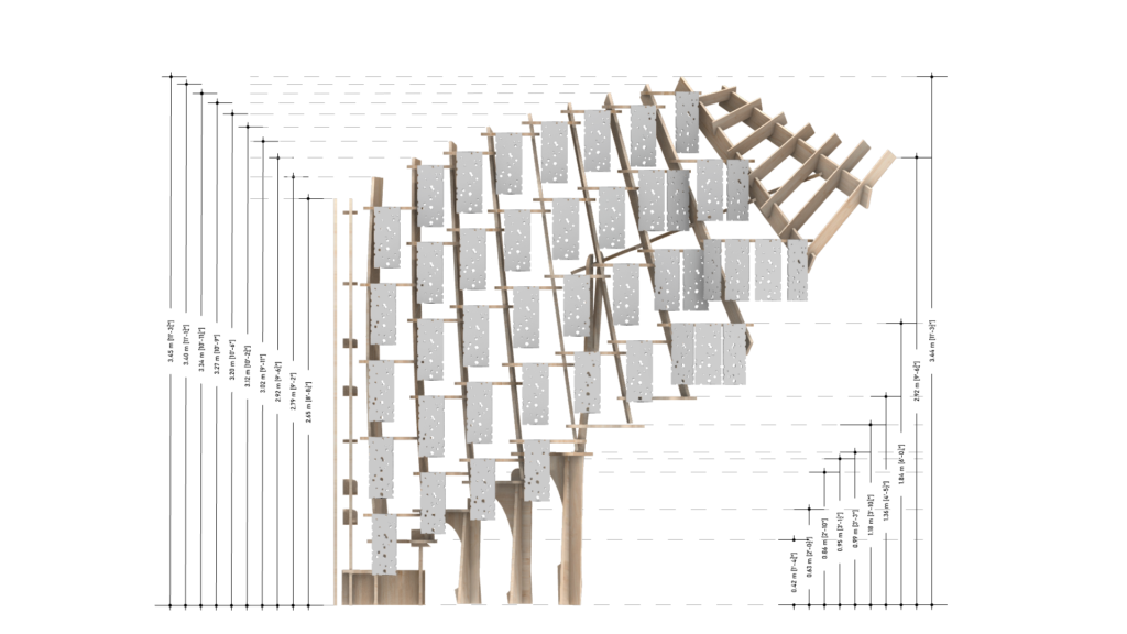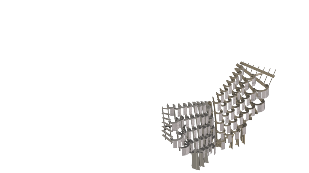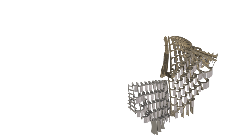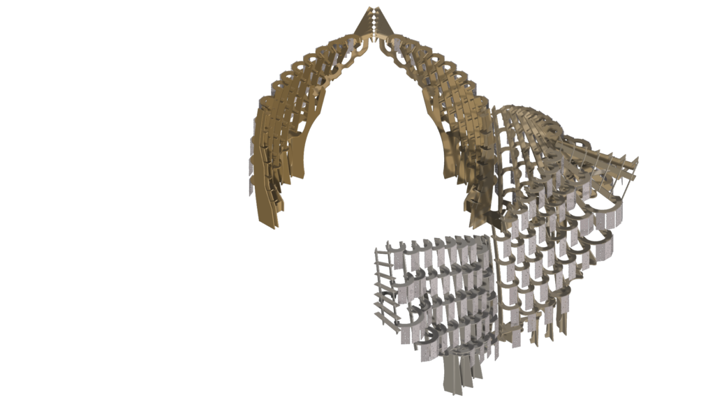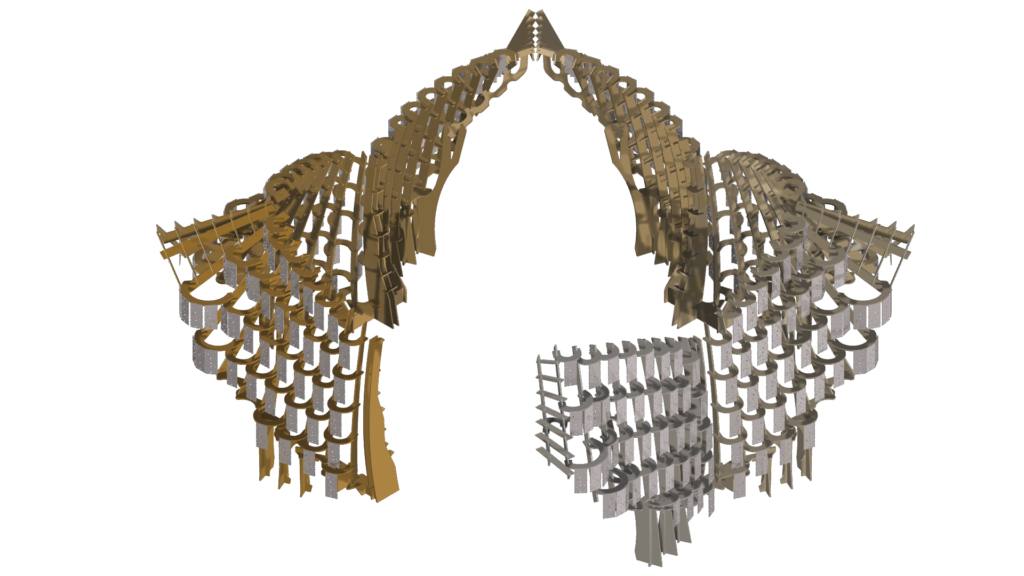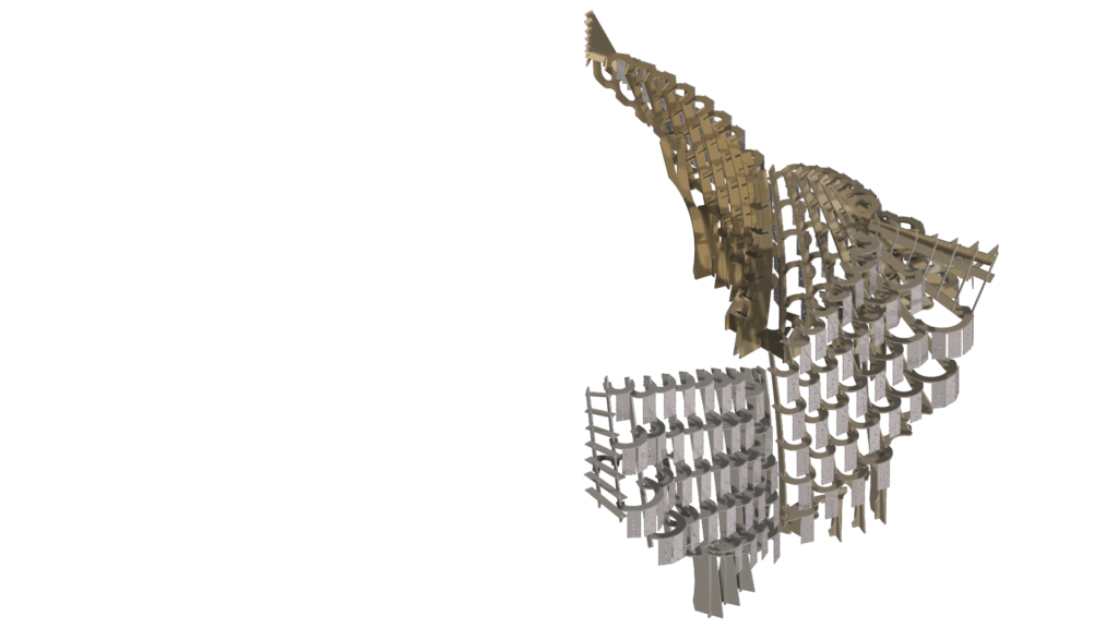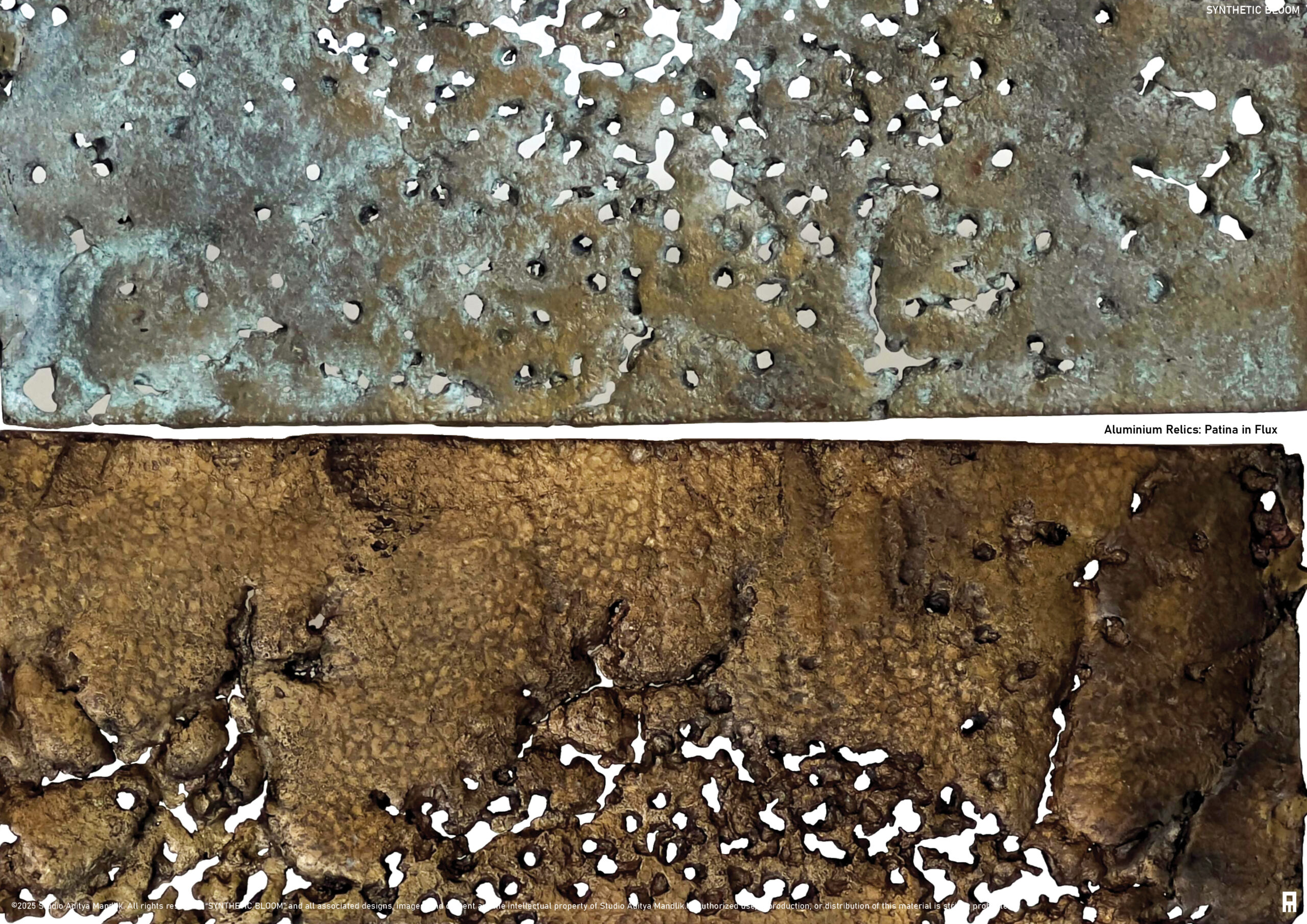 These cast aluminium plates, shaped by biological activity, now form the cladding of Synthetic Bloom. They are paired with CNC-milled composite wood modules that interlock to create the pavilion’s structural framework. Designed as an eight-part system forming a four-petal, flower-like configuration, the pavilion creates a porous spatial enclosure that encourages movement, gathering, and dialogue. Light and shadow animate its lace-like surfaces, allowing stories to emerge through collective occupation. Here, ornament becomes immersive rather than applied. It is embedded within structure, process, and performance simultaneously. While the form draws from traditional floral motifs, it is digitally evolved and algorithmically assembled—pointing toward a post-anthropocentric design ethic where materials, data, and ecological systems act as co-authors.